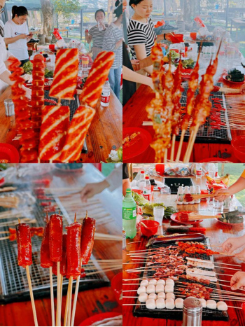 烧烤场中热闹喧嚣,有人准备水果,有人清洗食物,有人烤制美味,配合默契,忙得热火朝天、笑意满面!大家纷纷展示了各自的烧烤方法与技艺。